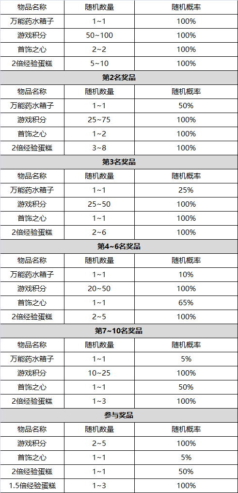 3、以杀人数量为排名,活动结束后系统发放,1~10名获得相应的“排名礼包”礼包清单,请见下面的附件内容。